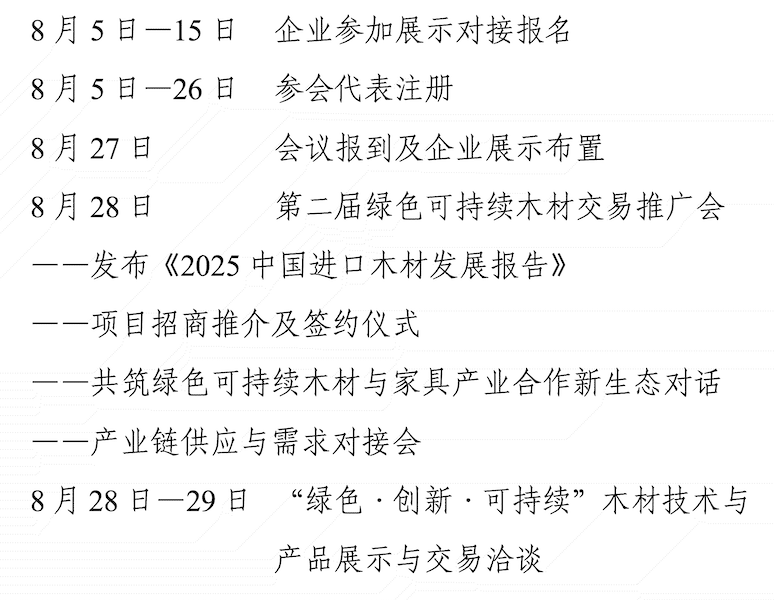 为着力提升木材产业链供应链的韧性和安全水平,依托南康千亿级家具产业集群及赣州国际陆港高效便捷的物流枢纽双重优势,搭建绿色可持续木材企业与南康家具行业高效供需对接平台,为产业集群提供可持续木材供给保障,助力南康家具行业高质量发展,木材节约发展中心与赣州国际陆港管委会定于2025年8月27日-29日在江西省赣州市南康区联合召开“第二届绿色可持续木材交易推广会”。现将有关事宜通知如下: