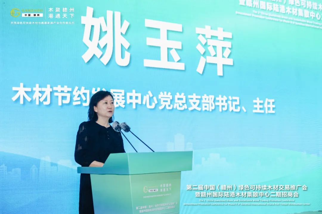 木材节约发展中心党总支书记、主任姚玉萍代表主办方对参会代表的到来表示欢迎,她在讲话中指出,做优做强特色产业集群,持续优化木材资源配置,是落实资源节约集约利用、推动木业行业绿色转型的重要举措。南康家具产业从传统实木制造起步,现已升级为千亿级产业集群。本次大会也是中心推动“木链计划——构建木材产业链供应链绿色生态圈”公益活动落地的重要举措,以港口、集群、市场三维联动,践行绿色发展理念,推动木材行业绿色发展。未来中心将继续携手赣州国际陆港管委会、赣州国际陆港集团有限公司,进一步促进木材产业链供应链优化,为产业合作提供“南康方案”。